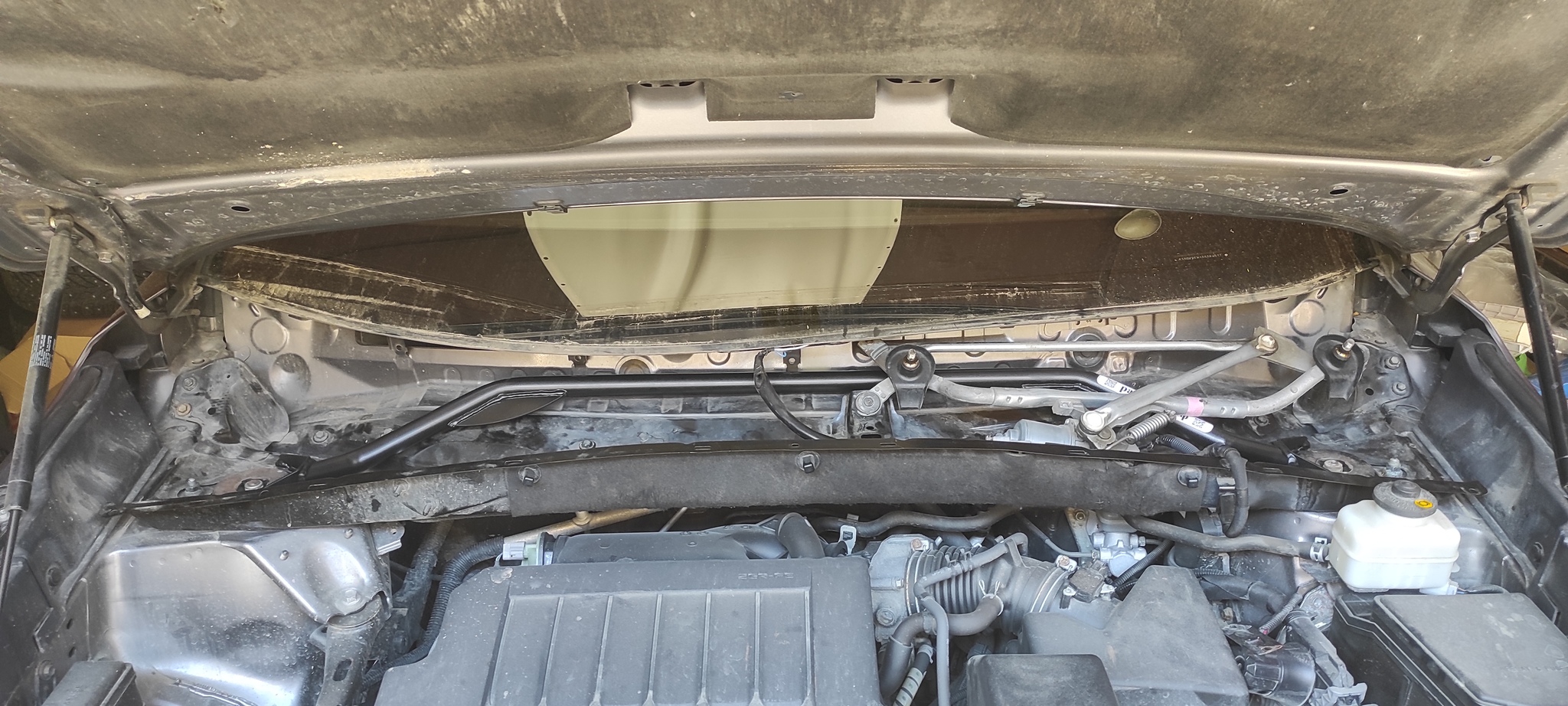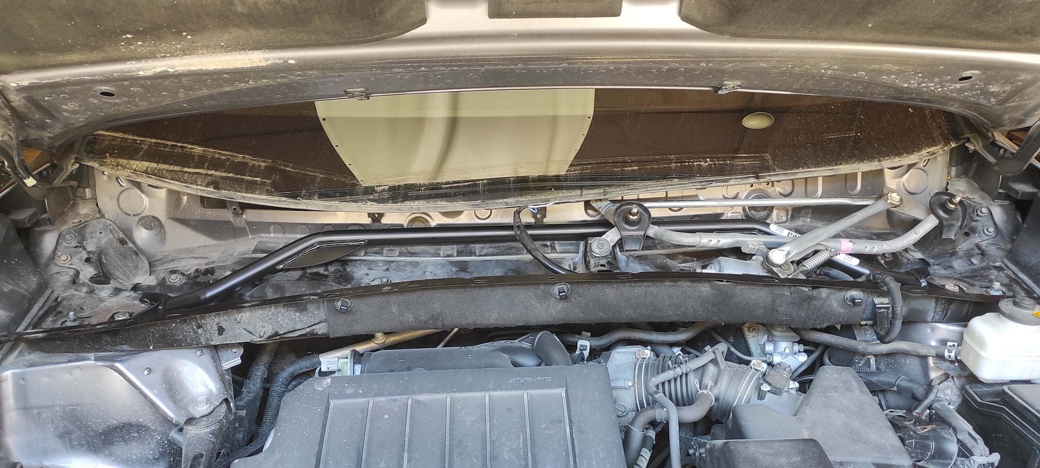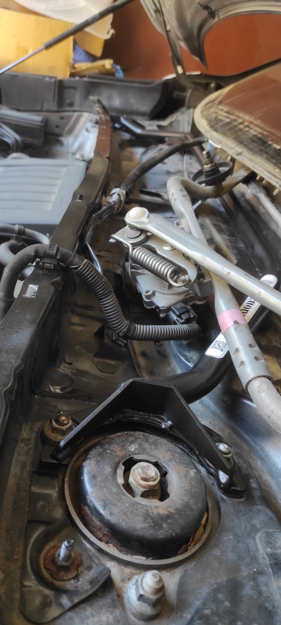 Для установки необходимо: снять стеклоочистители, пластмассовую решетку (жабо), закрывающую доступ к стаканам амортизаторов, и моторчик (трапецию) стеклоочистителей. После установки распорки собрать всё в обратной последовательности.