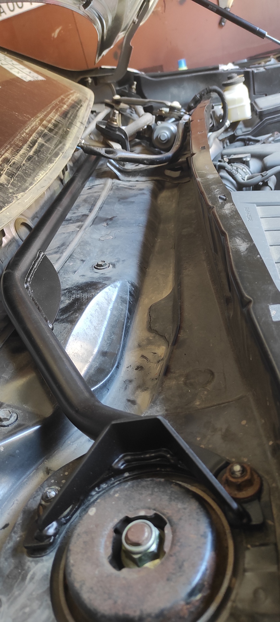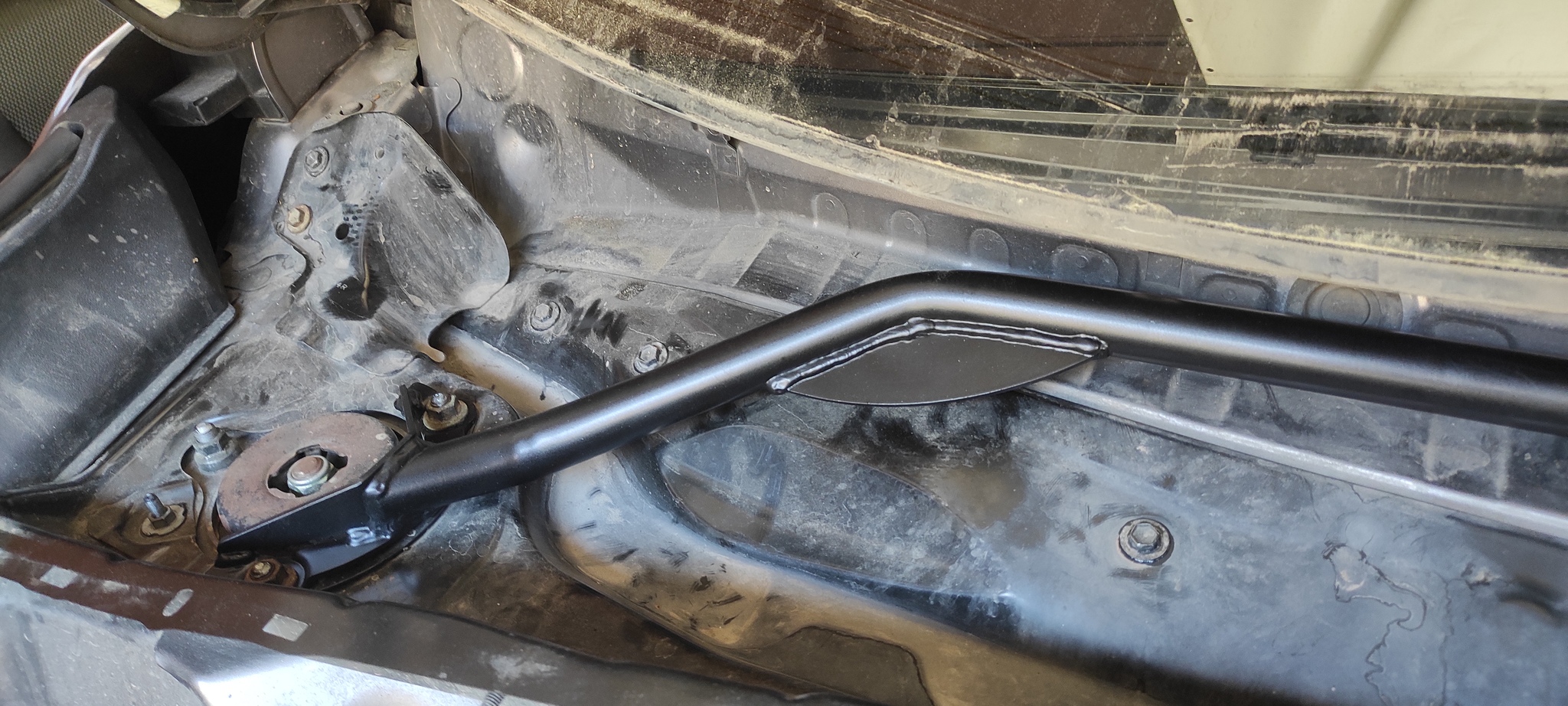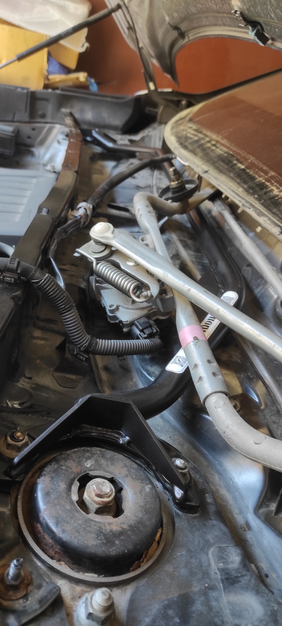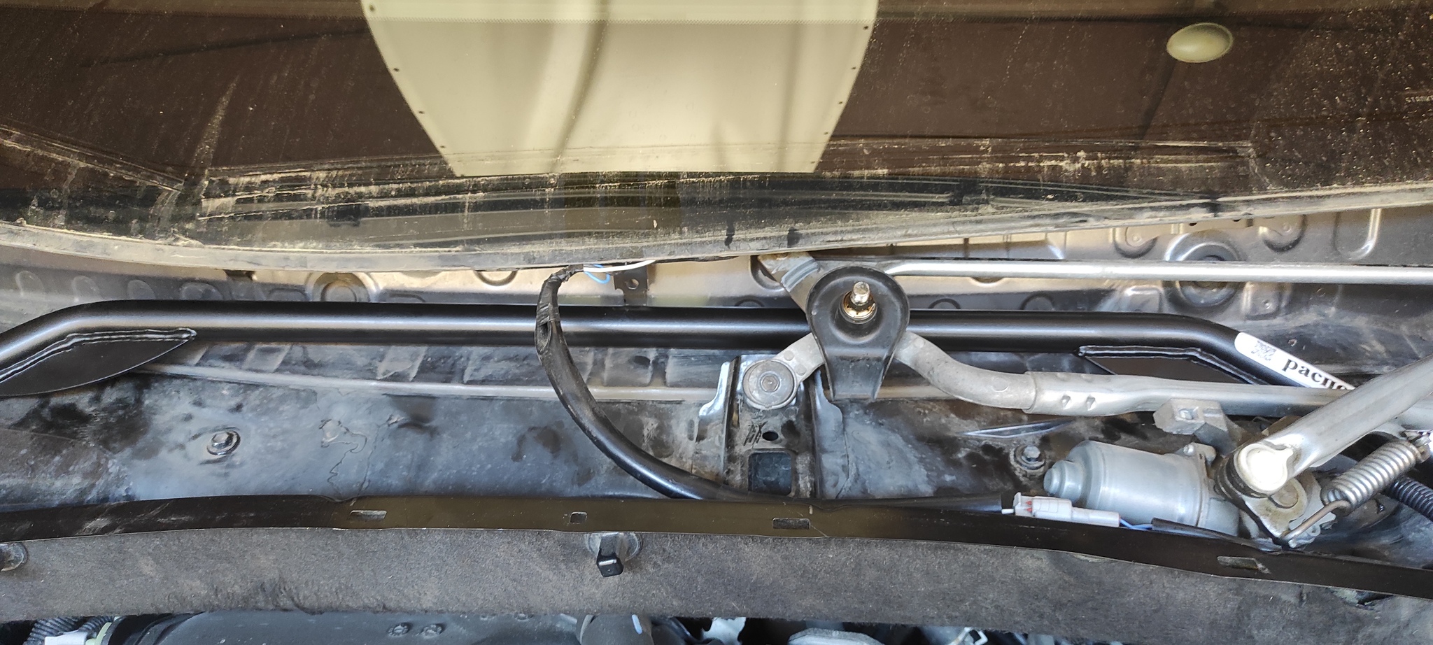 Для установки необходимо: снять стеклоочистители, пластмассовую решетку (жабо), закрывающую доступ к стаканам амортизаторов, и моторчик (трапецию) стеклоочистителей. После установки распорки собрать всё в обратной последовательности.