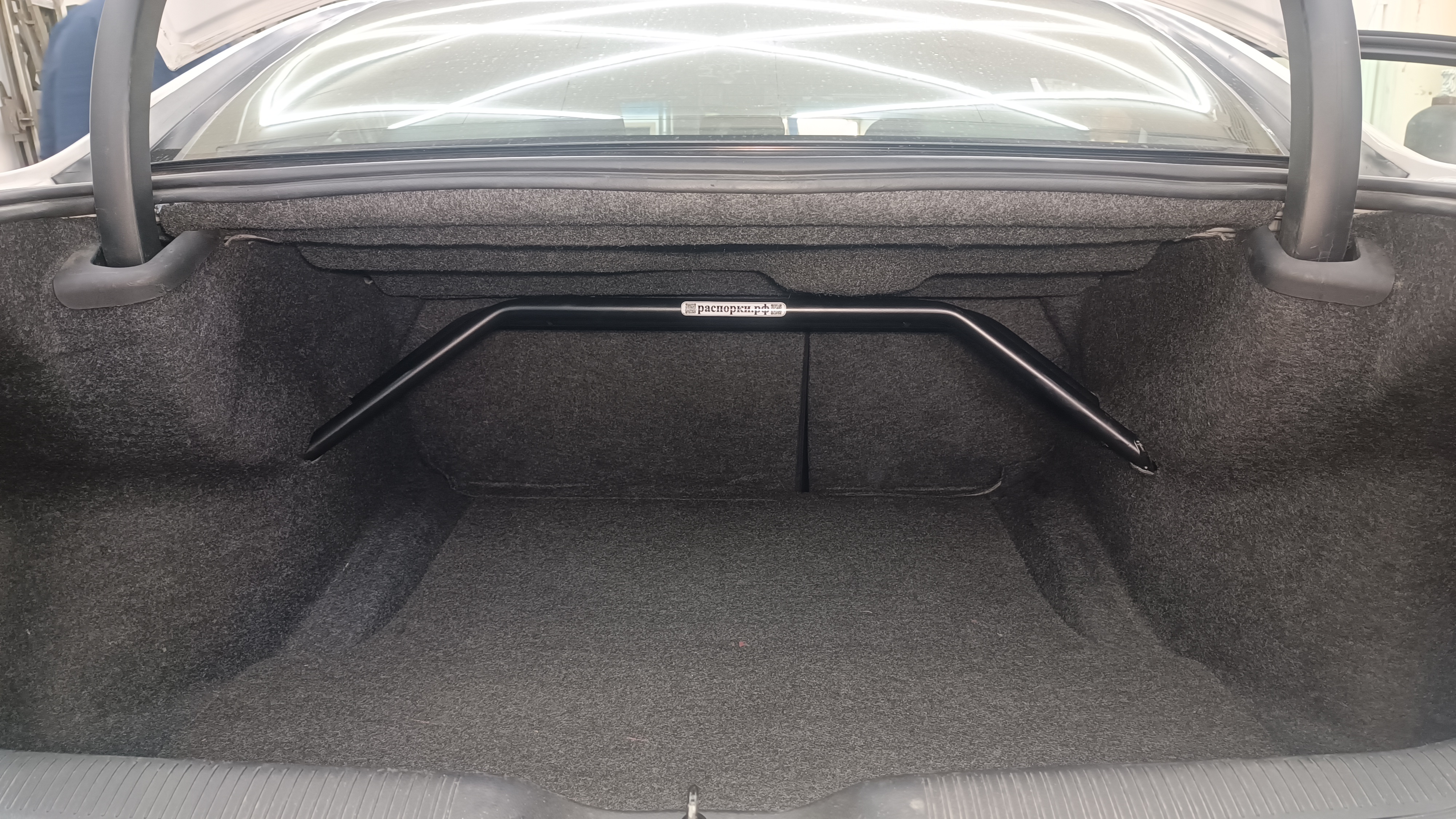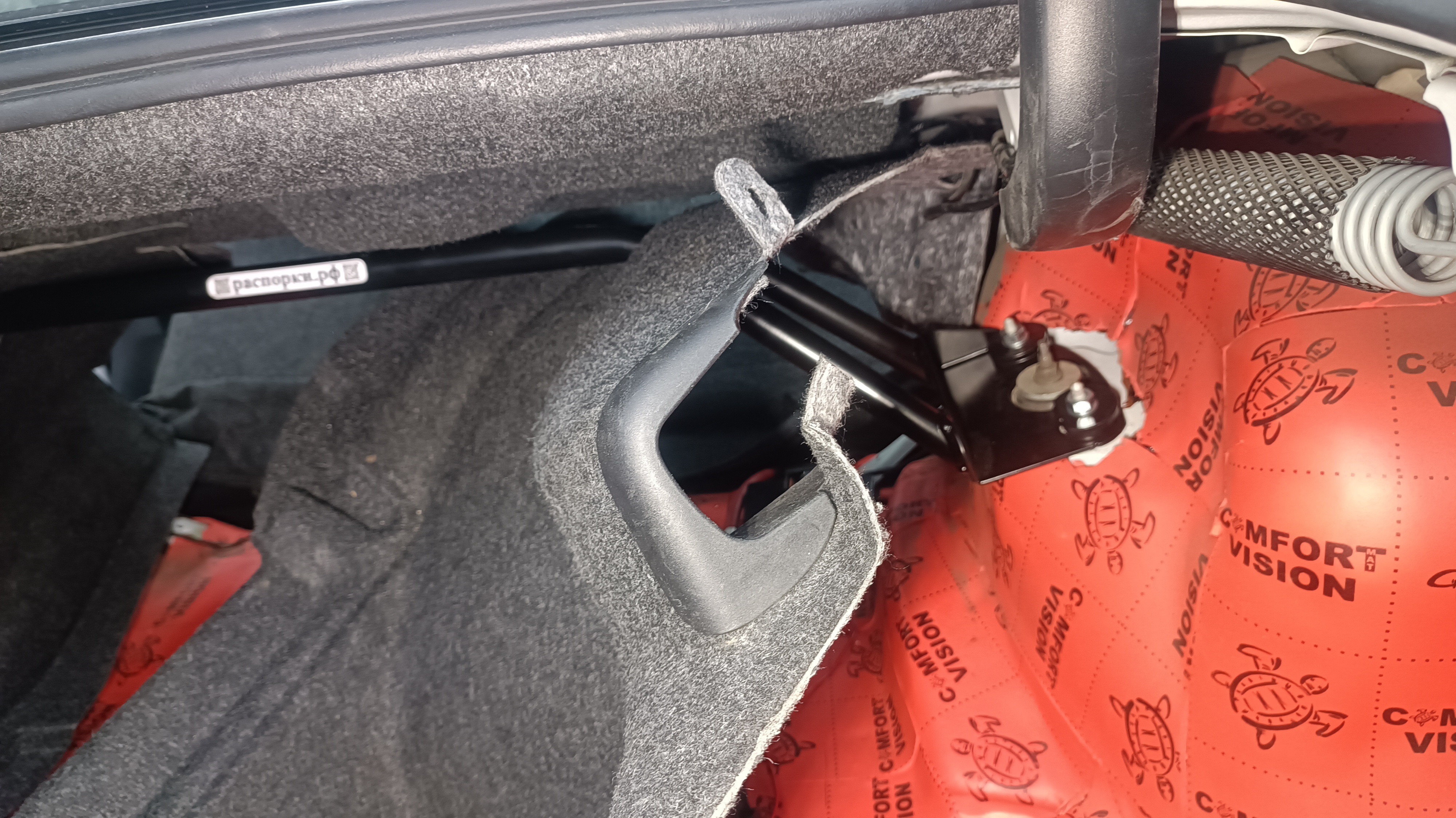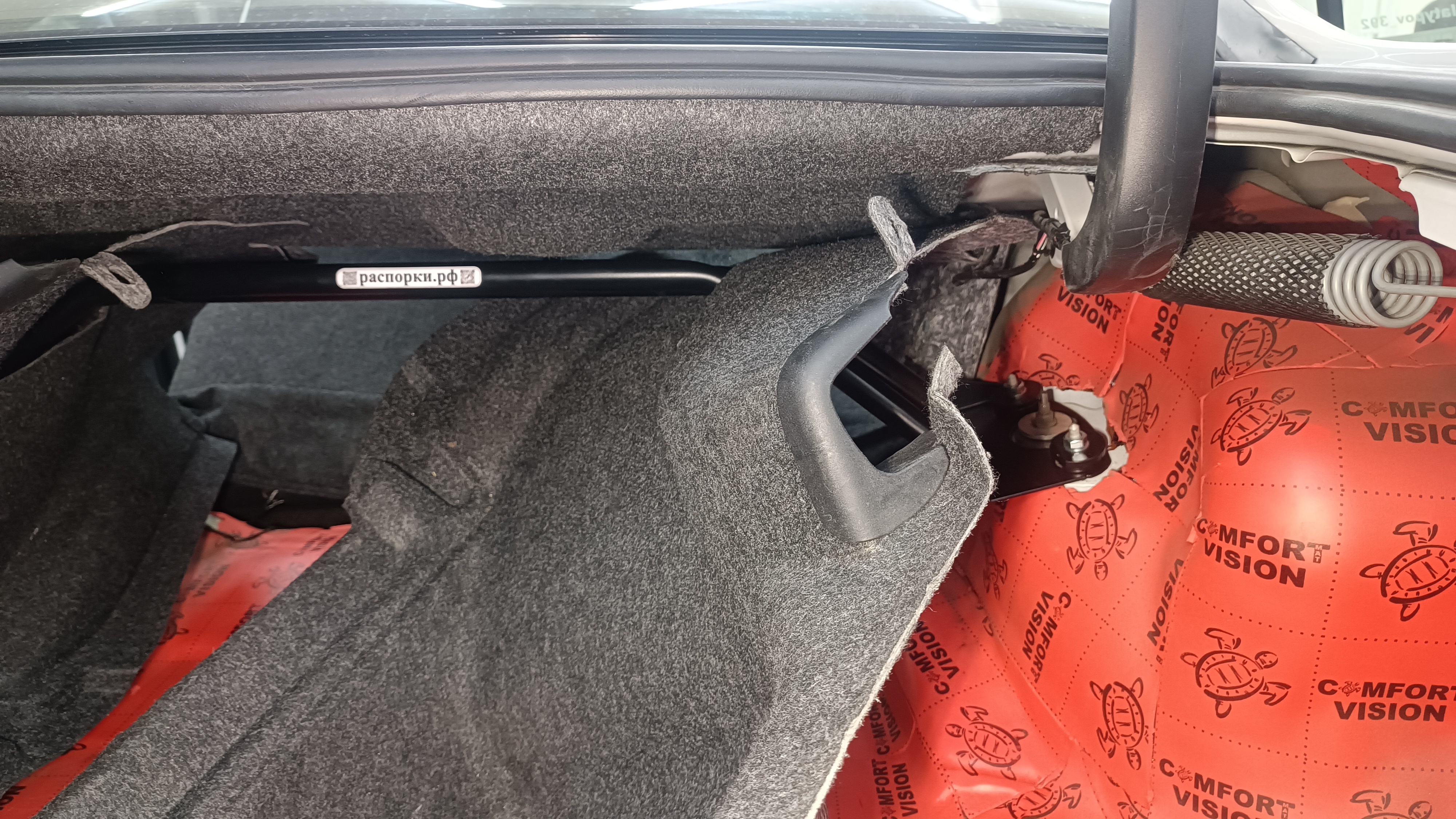 При установки распорки обшивку багажника необходимо прорезать по месту.