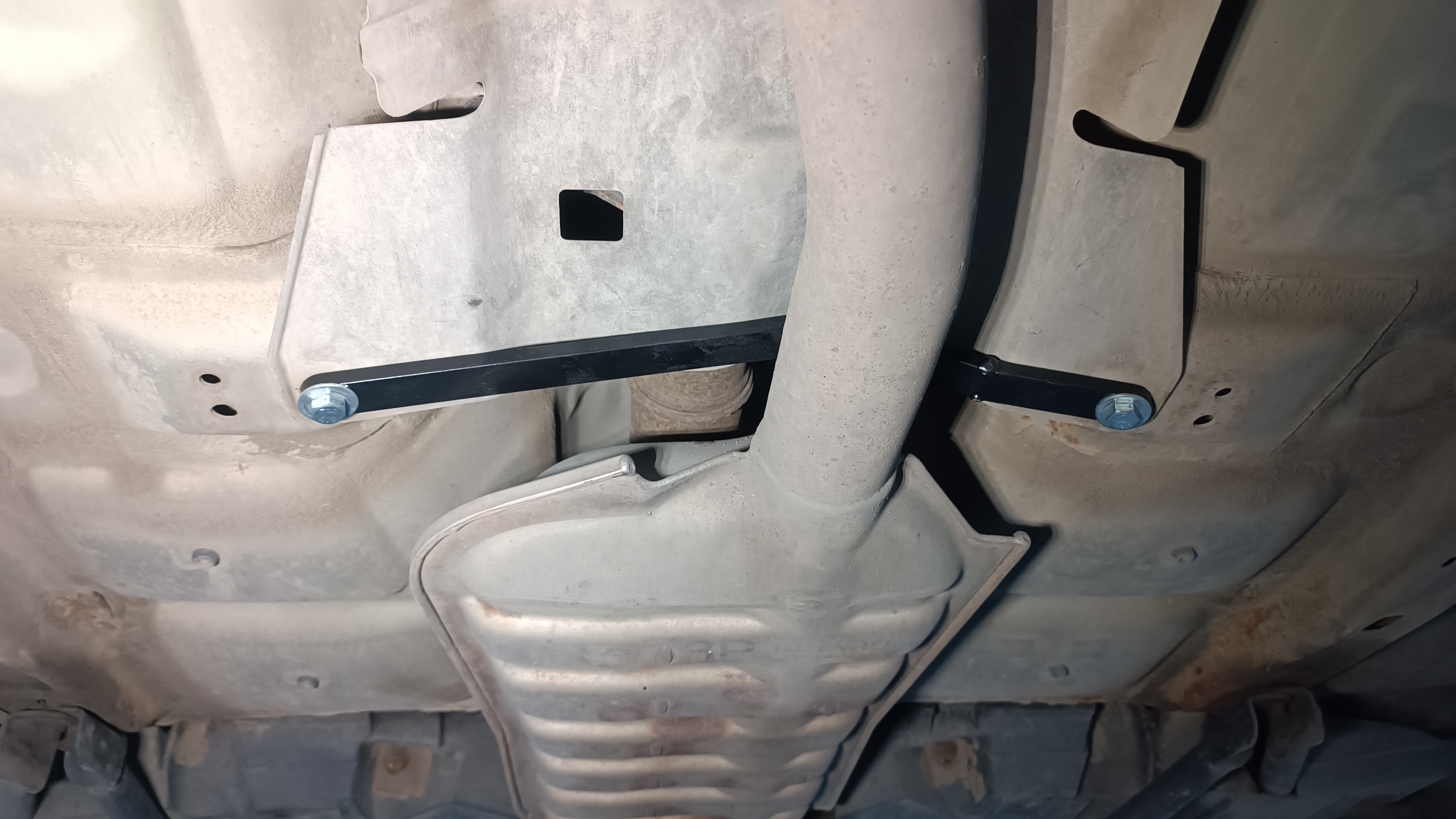 Усилитель тоннеля (усиление тоннеля в районе глушителя) Subaru Outback 4 (BR) со штатной системой выпуска отработавших газов и Subaru XV 1 (GP) с атмосферным двигателем FB20 и штатной системой выпуска отработавших газов (глушителя)